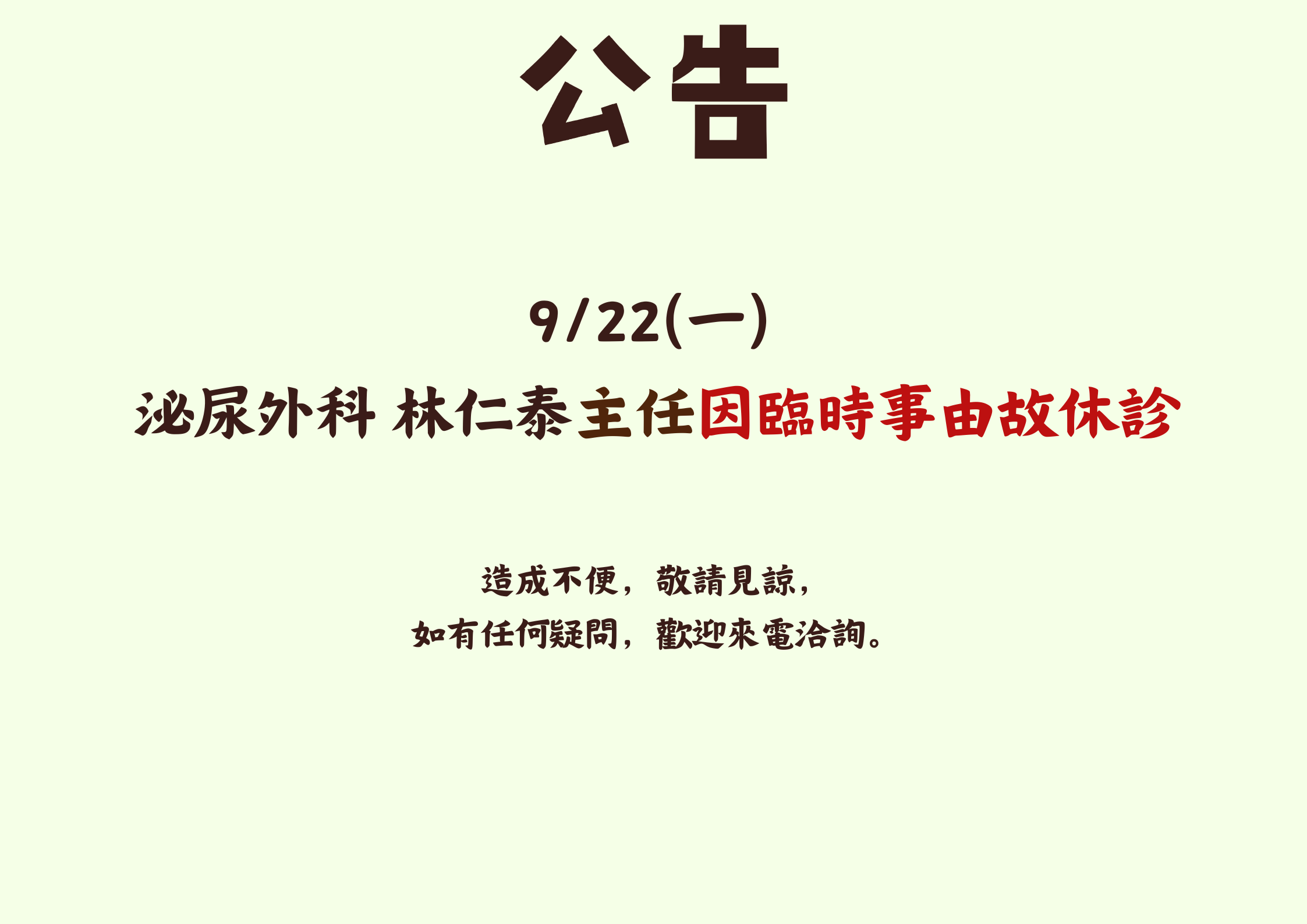 9/22(一)泌尿外科臨時停診