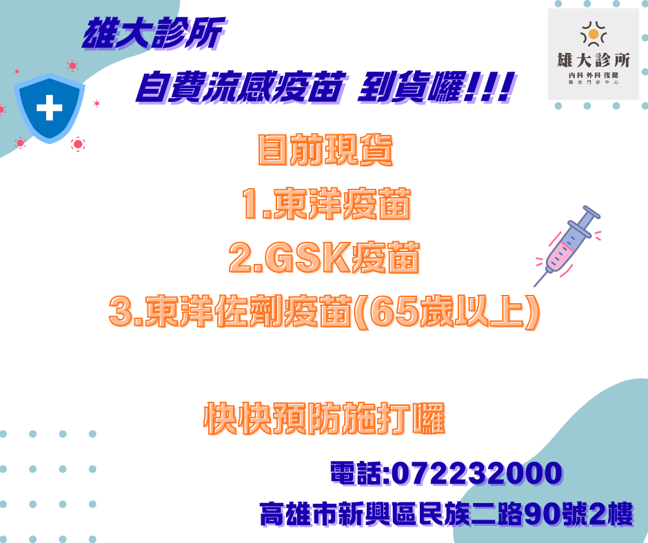 自費流感疫苗已經抵達本院! 一起打好健康底,流感不打擾! 數量有限,快快預約~ 健康先準備,安心過秋冬