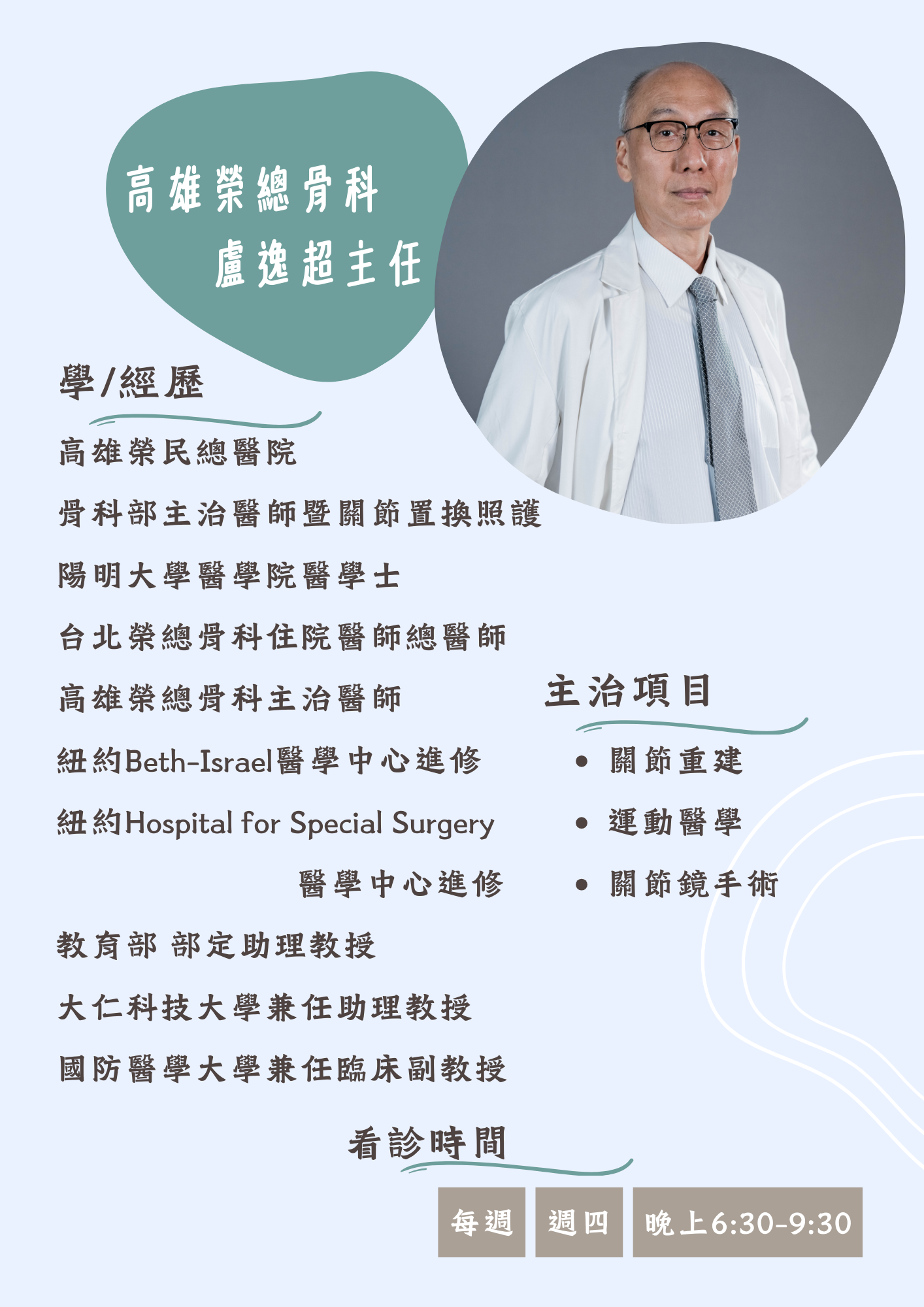 熱烈歡迎 高雄榮總骨科 盧逸超主任 3月起支援雄大